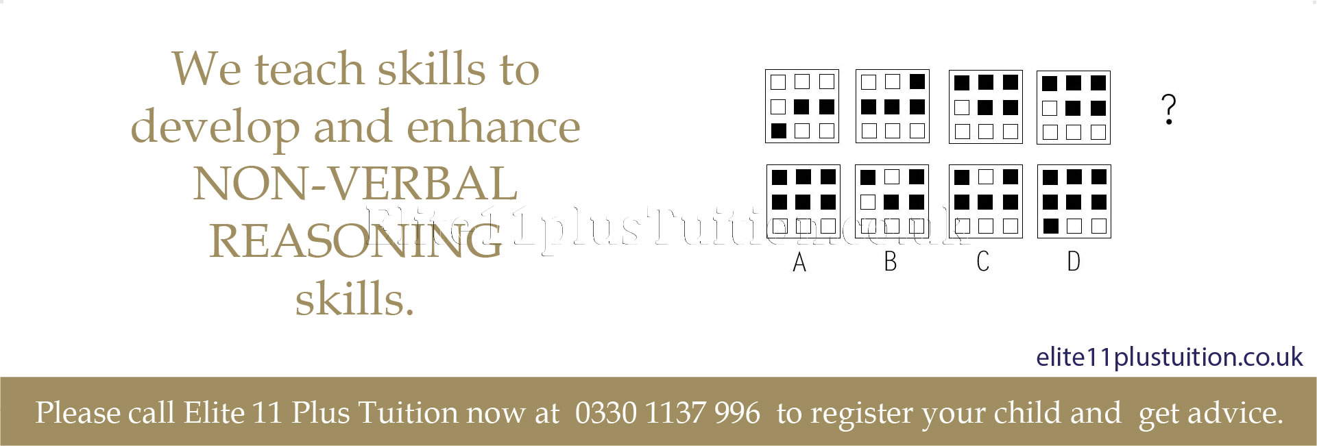 At Elite 11 plus tuitions we help our students to develop the ability to analyse and evaluate visual/pictorial information and look for word relationship and concept recognition. We develop the child’s skill in solving pictorial problems based on series, analogy and classification and so on. In our experience, for a child to do well in a non-verbal reasoning test, needs to display a good spatial awareness and imagination.